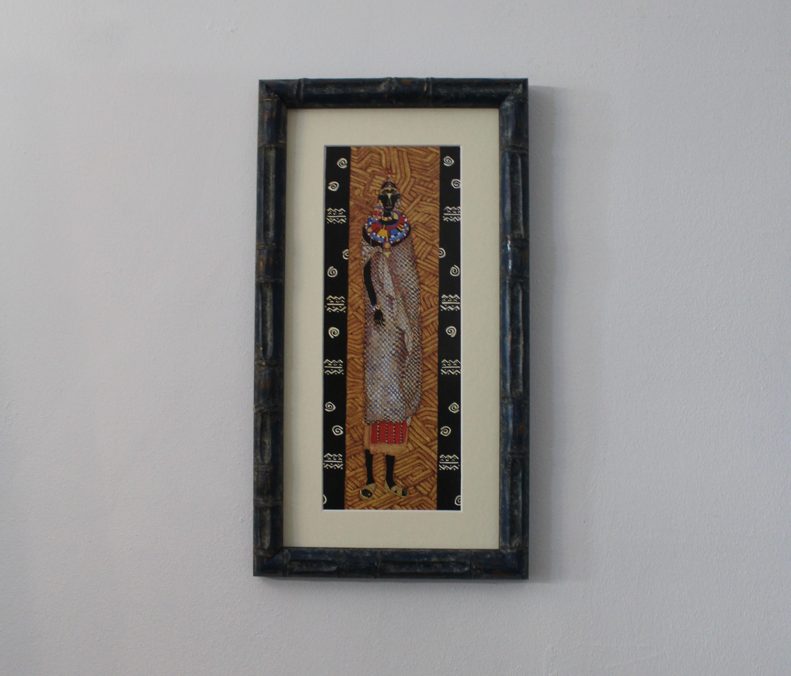 Marco de madera auténtica, la moldura simula una caña de bambú de color azul. El cuadro contiene passepartout crudo, una lámina con un Masai, el cristal con acabado brillante y la trasera resistente y bien sellada para evitar la entrada de polvo y humedad.