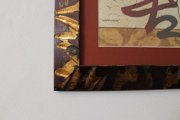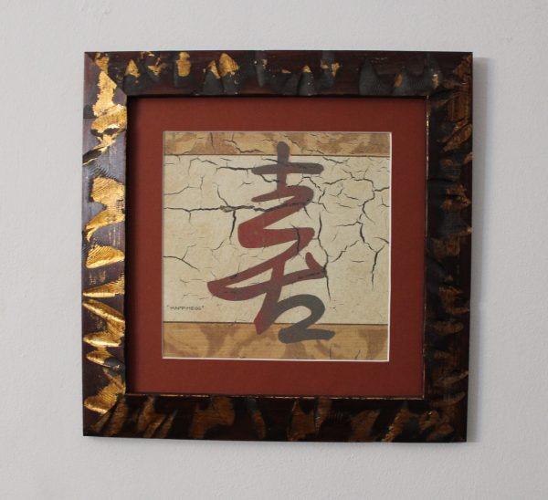 Marco en forma de pirámide color caoba, decorado con oro en hoja verdadero también llamado “pan de oro”. Láminas letras asiáticas con un passepartout crudo. Cristal efecto brillante y la trasera resistente y bien sellada para evitar la entrada de polvo y humedad. Ideal para dar un toque étnico a cualquier habitación.