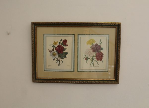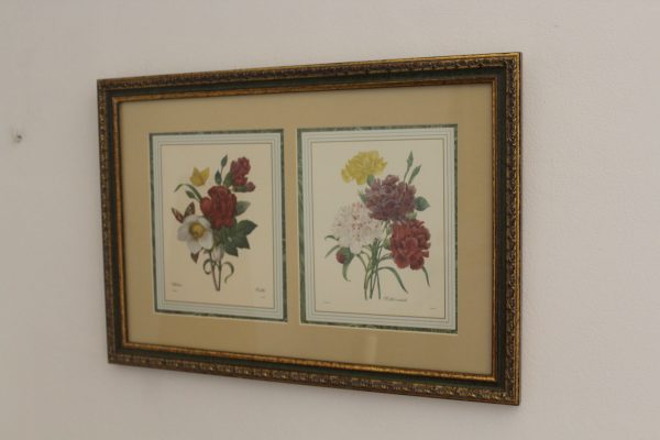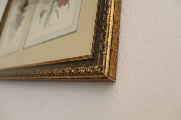 Marco con moldura de madera auténtica, decorado clásico con talla de color oro y una banda verdosa recorriendo la parte interior. Con passepartout de 2 ventanas color beige, 2 laminas con motivos florales incluidas y cristal brillante. Trasera dura y resistente sellada para evitar entrada de polvo y humedades.