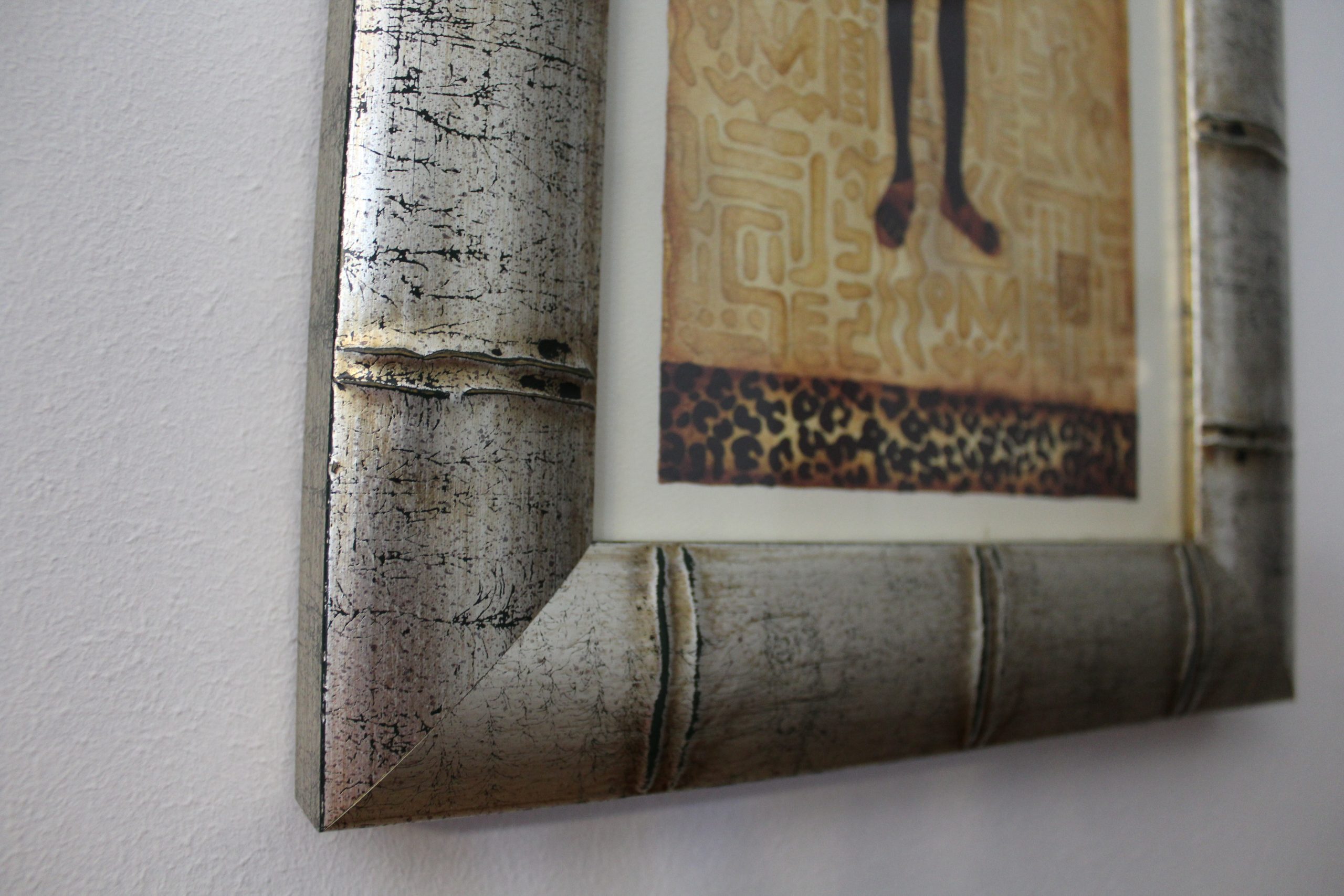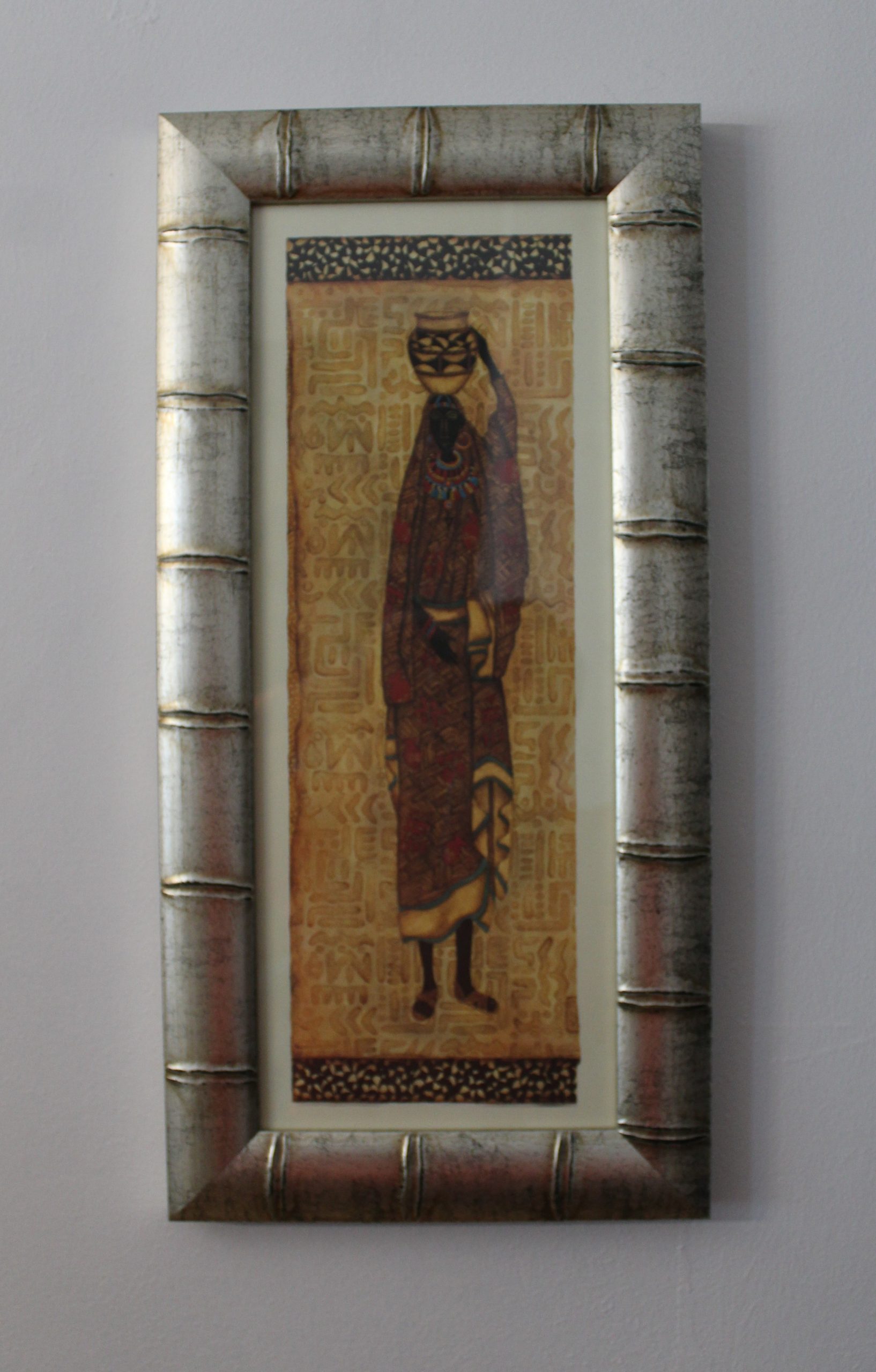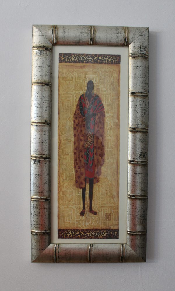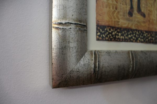 Marco de madera autentica con imitación bambú, color de la moldura plata vieja con craquelado negro. Láminas Masai hombre y mujer incluidas en el precio. El cristal es brillante. Trasera resistente y firme sellada para evitar humedades y entrada de polvo.