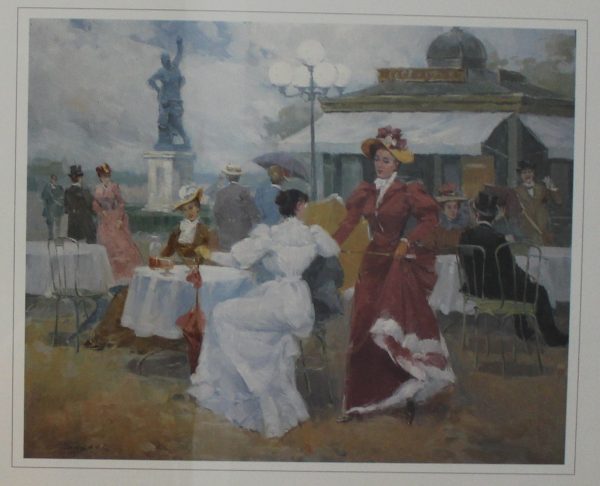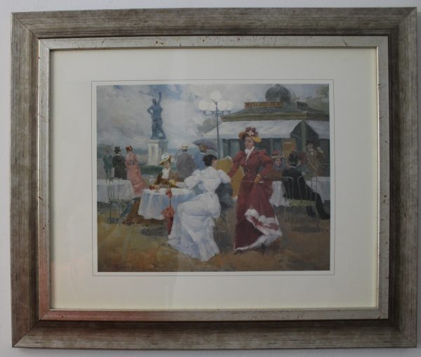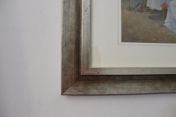Marco de madera auténtica moldura color plata vieja, el cuadro tiene incluida una lámina parisina con damas de época. El cuadro tiene cristal brillo y trasera dura y resistente sellada para evitar entrada de polvo y humedades.