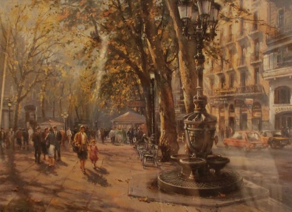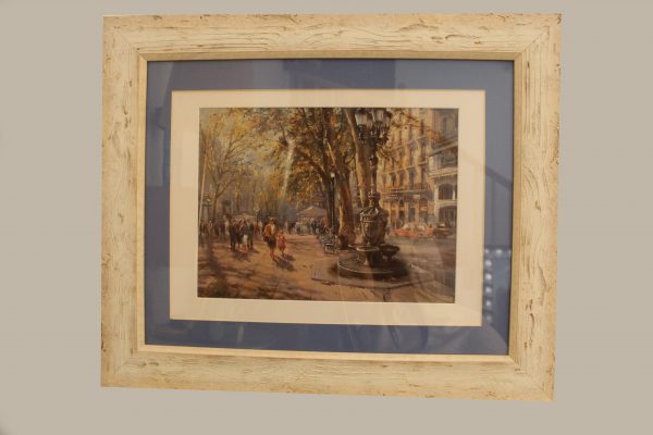 Marco con moldura de madera auténtica, decorado rústico blanco rozado. Con doble passepartout de colores azul y blanco para dar profundidad al cuadro. Lámina fuente de Canaletas (Barcelona) y cristal brillante.