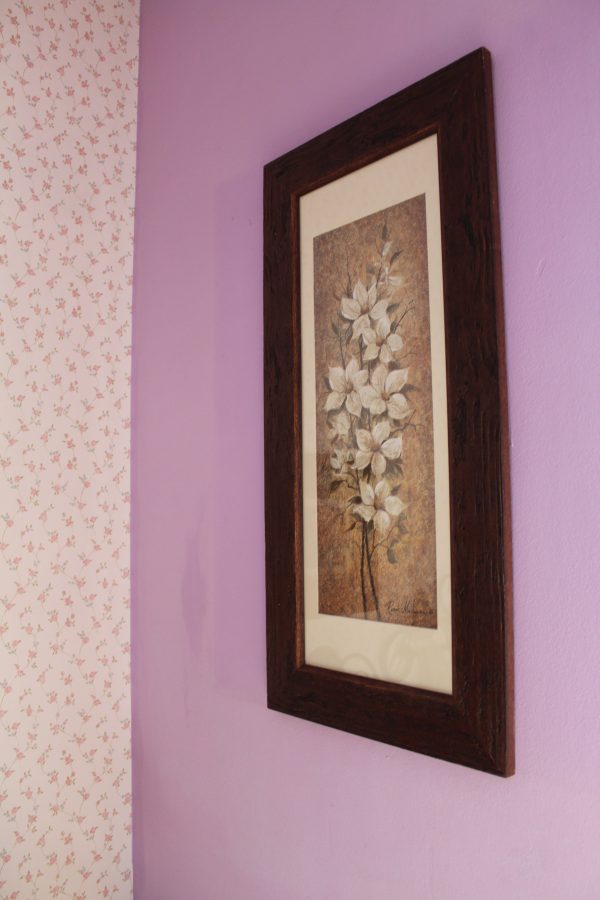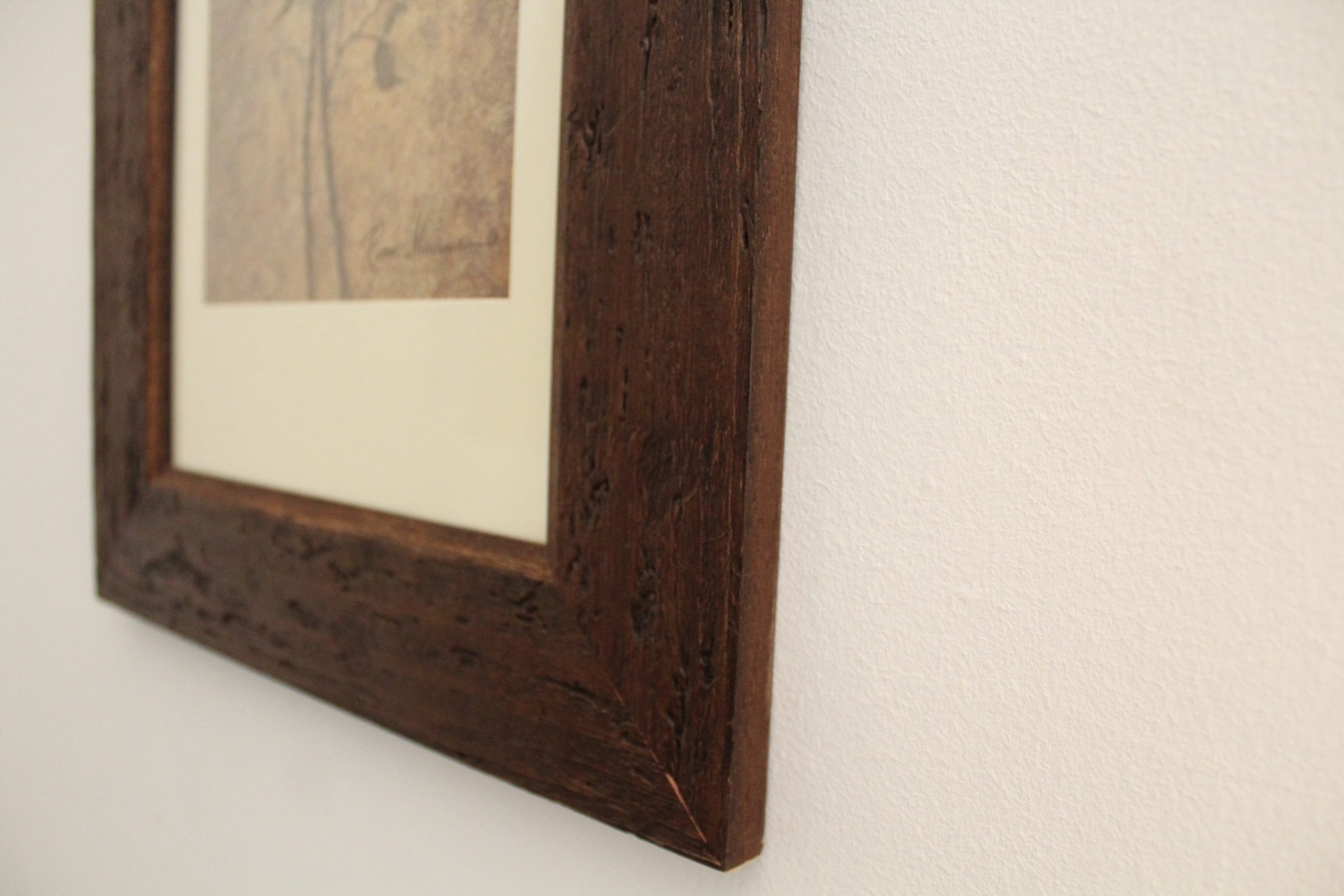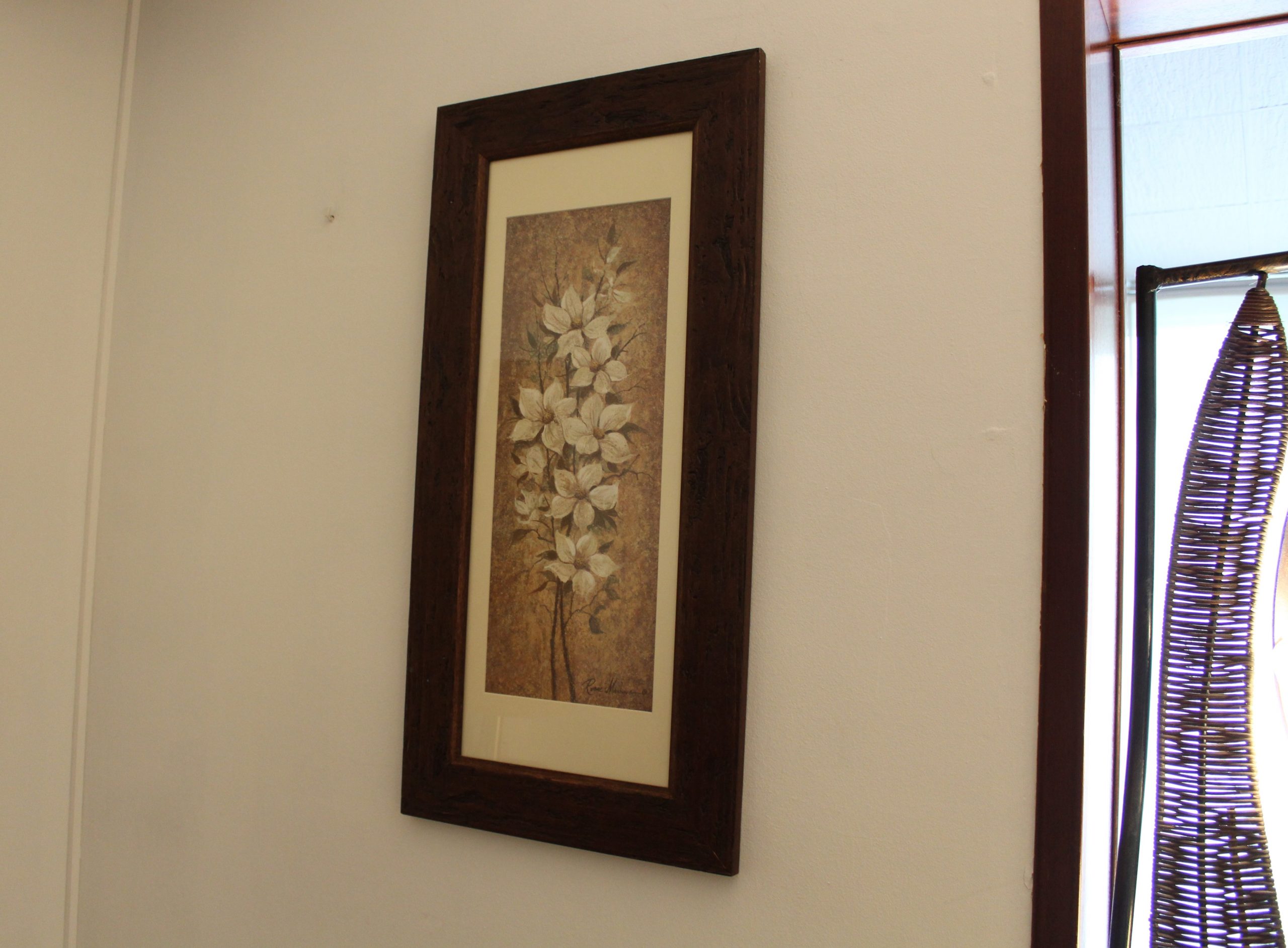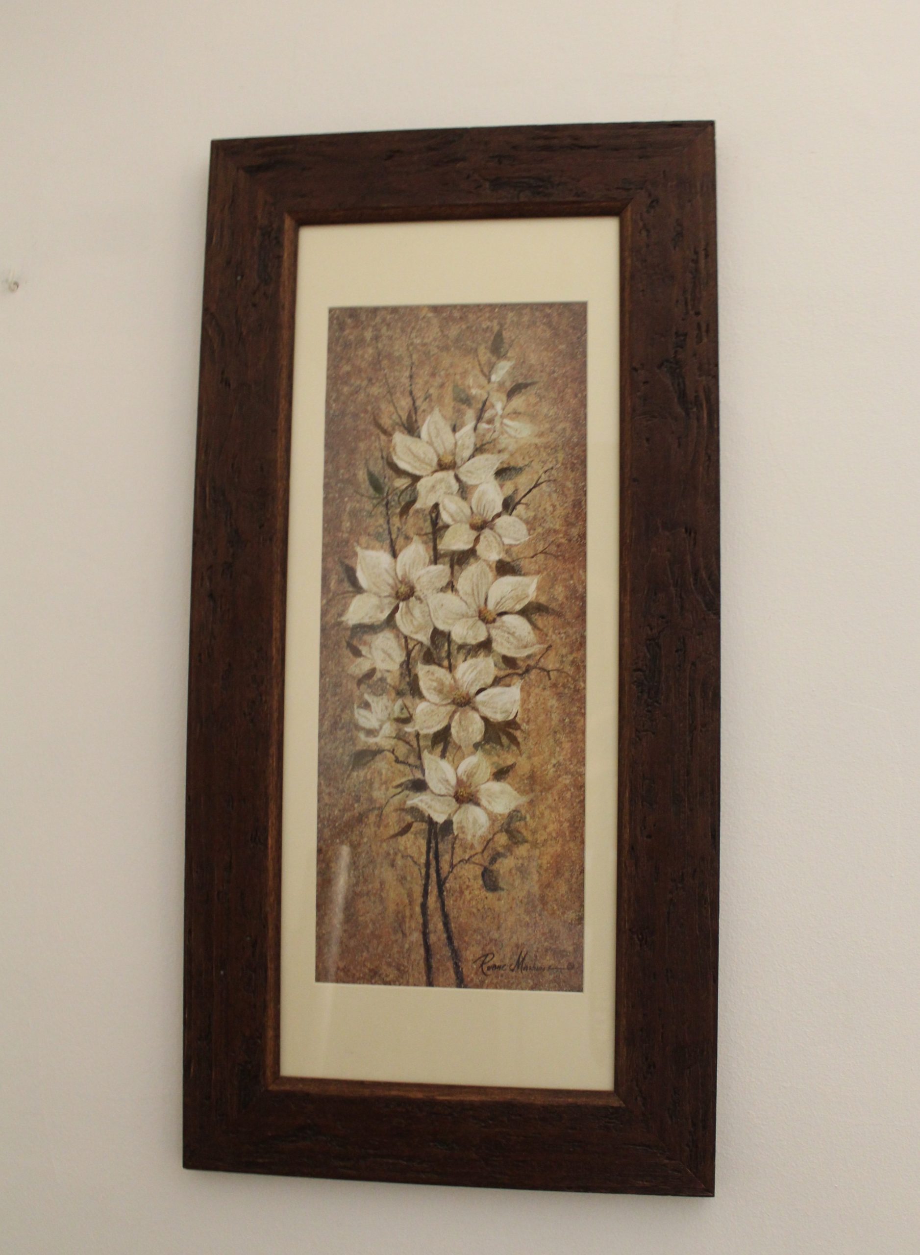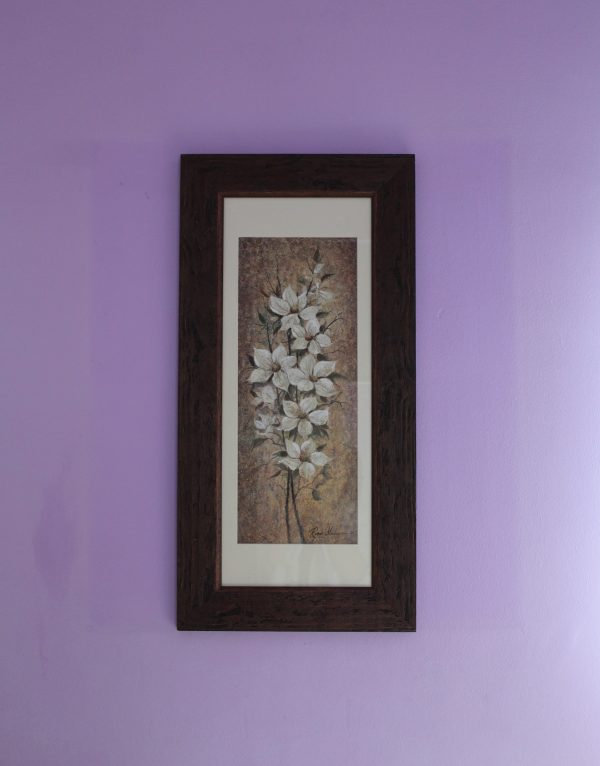 Marco con moldura de madera auténtica, decorado rústico de color marrón oscuro. Con passepartout de color crudo, lámina con motivos florales incluida y cristal brillante.