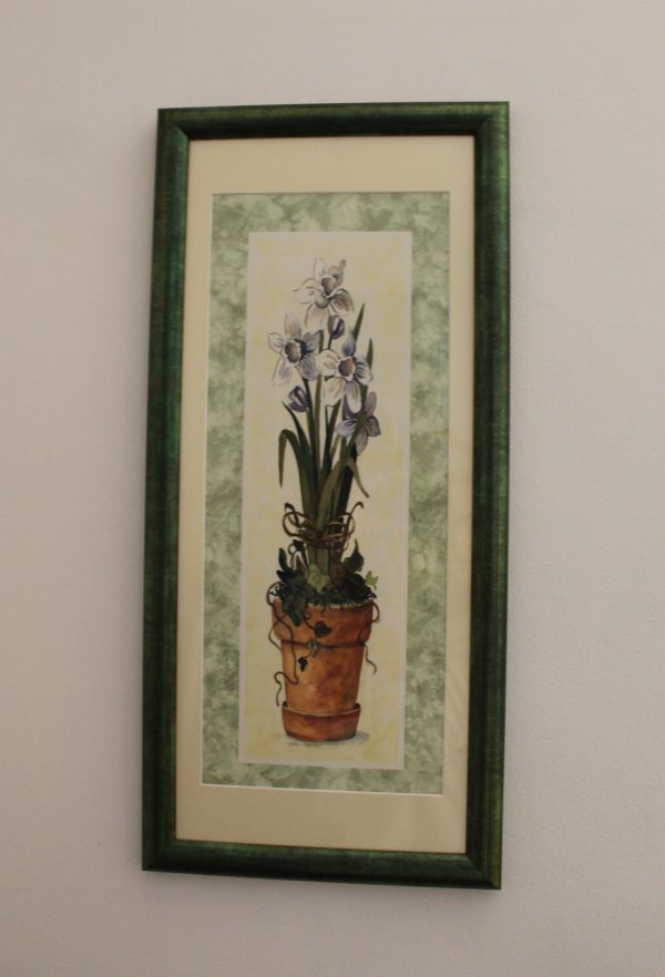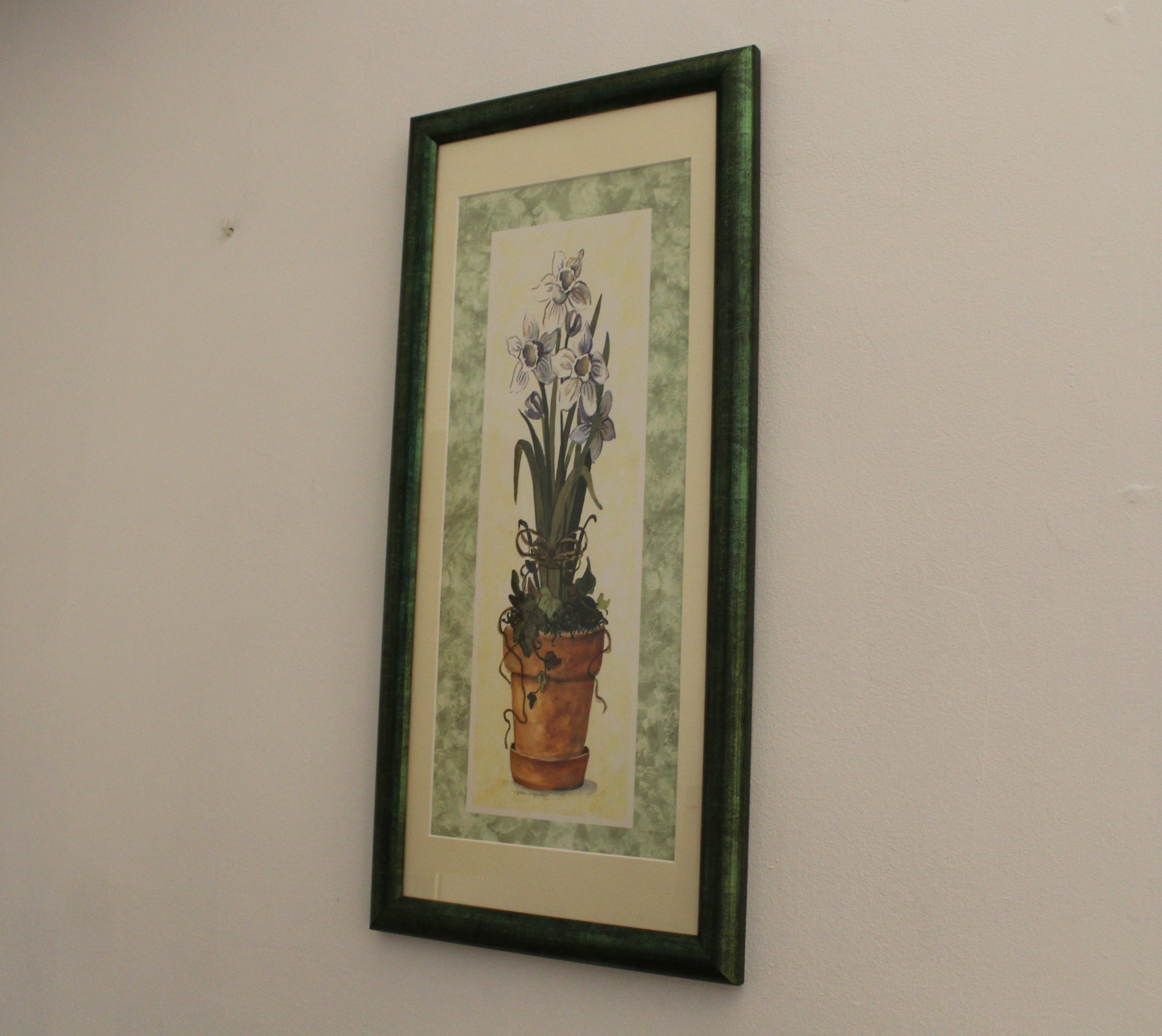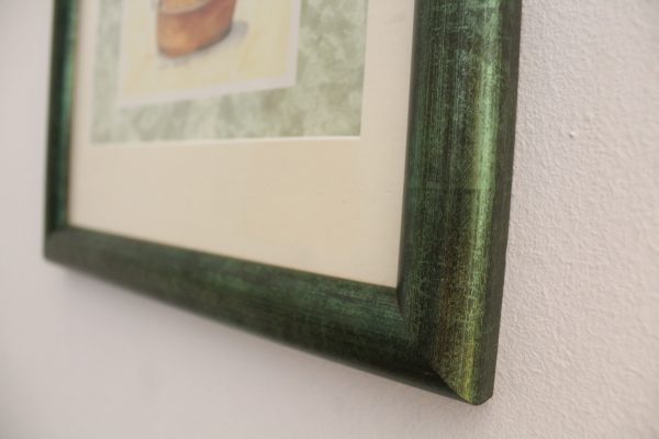 Marco con moldura de madera auténtica, decorado verde metalizado . Con passepartout de color crudo, lámina con motivos florales incluida y cristal brillante. Trasera resistente y firme sellada para evitar humedades y entrada de polvo.